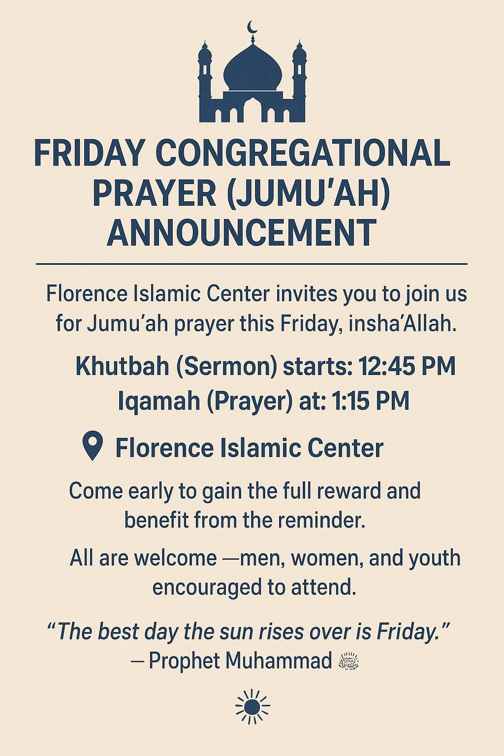 Florence Islamic Center Invites you to join us for Jumu’ah prayer this Friday, Insha’Allah Khutbah (Sermon) starts: 12:45 PM Iqamah (Prayer) at: 01:15 PM